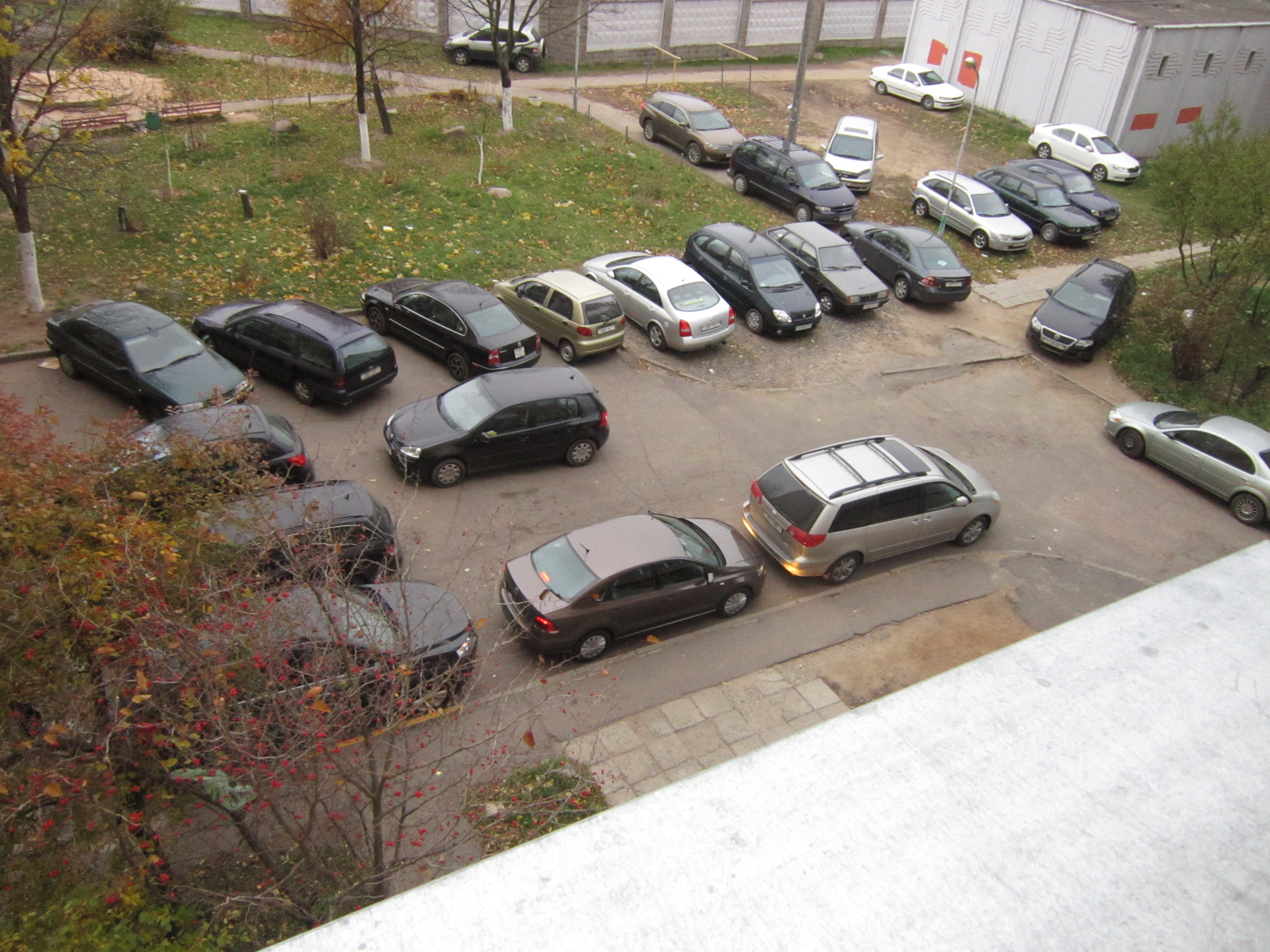 После ремонта тепловых сетей часть зеленой зоны не была восстановлена, а засыпана щебнем, что позволило разместить еще 3-4 автомобиля. В связи с катастрофической нехваткой мест для стоянки жильцы вынуждены парковаться как на тротуарах, так и на зеленой зоне, которая давно уже не зеленая, тем самым провоцируя неоднократные конфликтные ситуации.