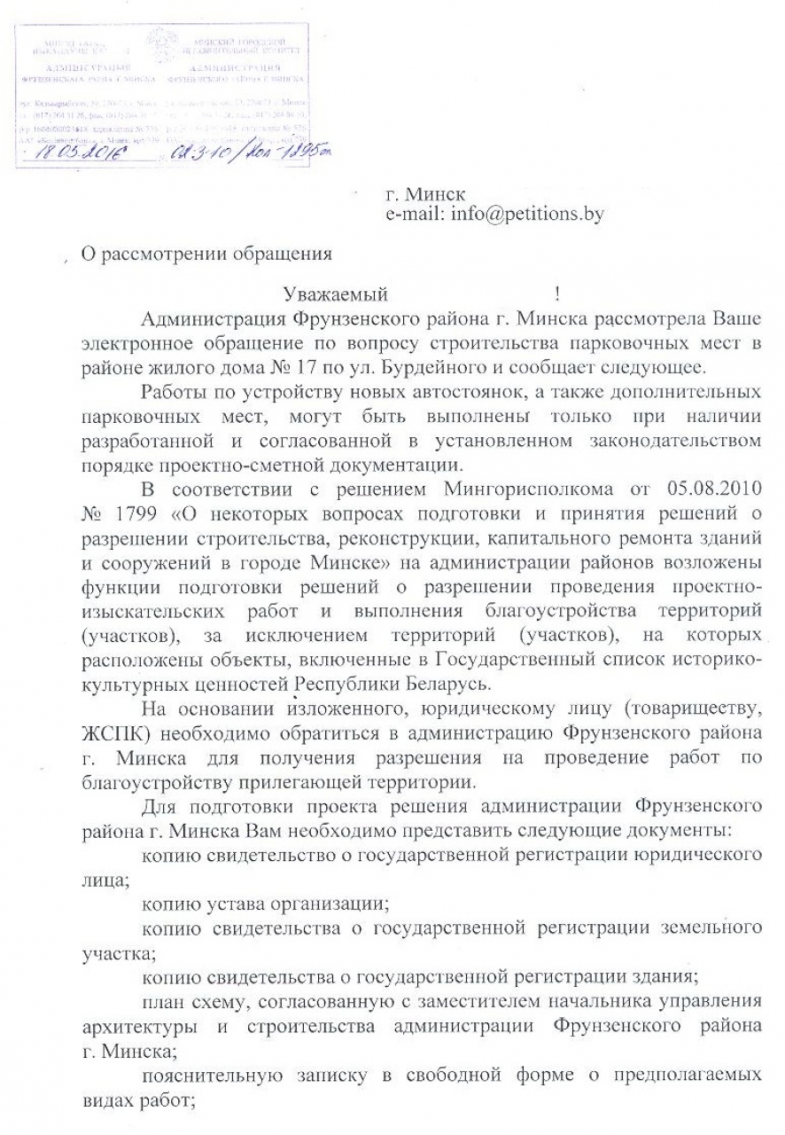 Во дворе дома №17 по ул. Бурдейного в г.Минске острая нехватка мест для стоянки автотранспорта жильцов, поскольку дом 12-этажный, состоящий из двух корпусов, а внутридворовая территория сама по себе небольшая, а во время постройки проектировалась только разворотная площадка 12х12 метров. Естественно, в нынешней ситуации этого очень мало.