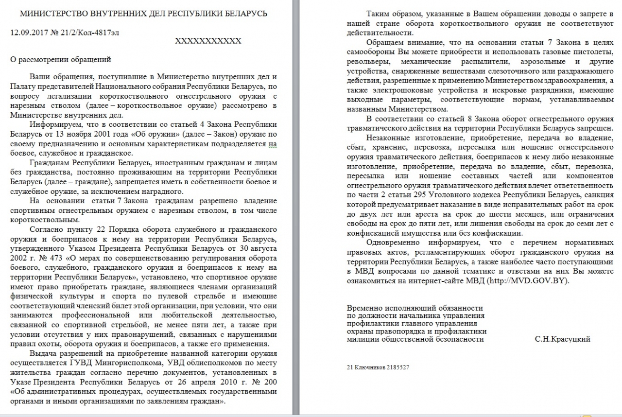 "Огнестрельное короткоствольное нарезное оружие в РБ находится под запретом. Охотники и спортсмены с безукоризненным стажем владения гладкоствольным оружием получают разрешение на приобретение нарезного оружия, но за исключением короткоствольного. В чем причина данного ограничения законопослушного гражданина? Может стоит пересмотреть закон об оружии с приравниванием короткоствольного нарезного оружия к длинноствольному нарезному оружию? Рассмотреть вопрос приобретения с целью хранения и использования только на территории спортивных организаций короткоствольного нарезного оружия? Ведь таким образом мы сможем поддержать: отечественного производителя оружия, стрелковый спорт, укрепить безопасность граждан нашей страны и повысить сознательность граждан. "