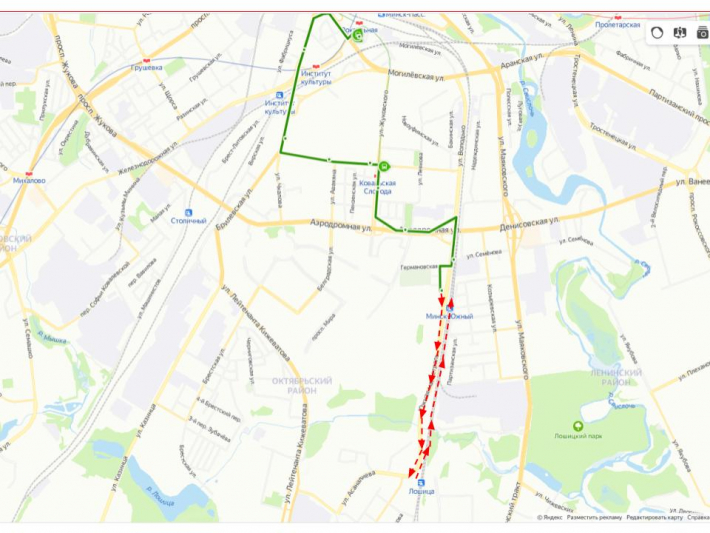 Короткий маршрут автобуса №4, с конечной точкой у ж/д станции "Минск-Южный".