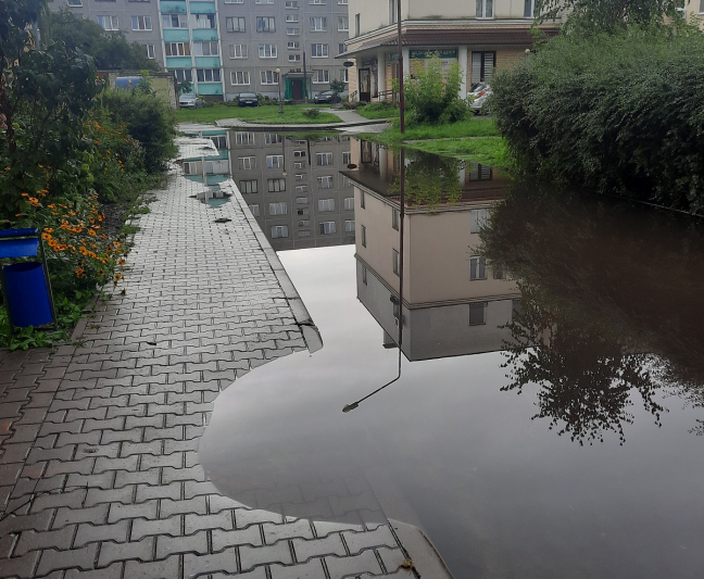 После обильных дождей двор, расположенный по адресу: город Брест, проспект Машерова, дом 65, превращается в настоящее "море"