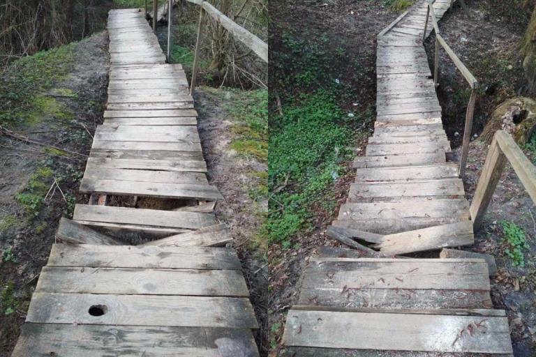 Деревянная пешеходная лестница через овраг от ул.Чапаева и ул.Щорса до ул.Ветровая в Мозыре находится в аварийном состоянии.