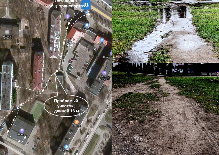 Отсутствует покрытие на участке с устойчивыми пешеходными и транспортными связями на некоторых улицах Новополоцка.