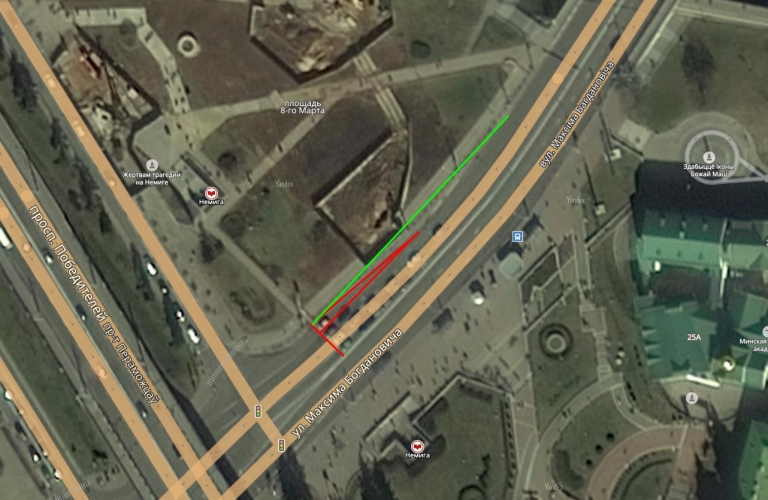 Общественный транспорт останавливается на светофоре и блокирует поворот со стороны Богдановича в сторону пр. Победителей.