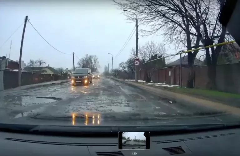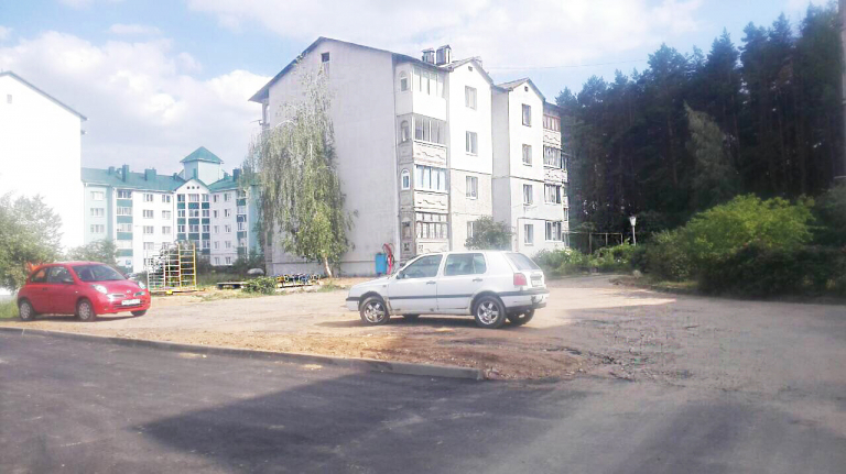 Ямы на дороге и малое количество парковочных мест рядом с магазином в микрорайоне Серебрянка.